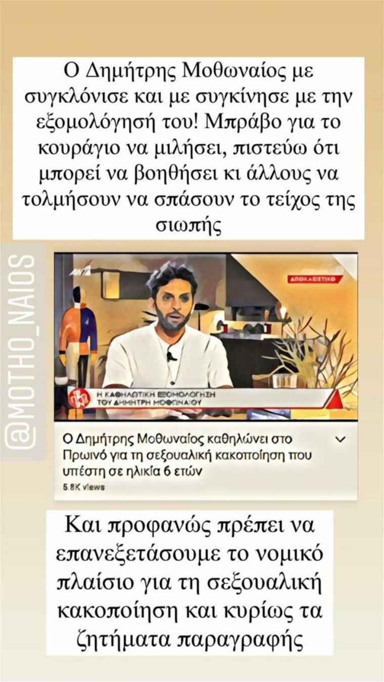 «Ο Δημήτρης Μοθωναίος με συγκλόνισε και με συγκίνησε με την εξομολόγησή του. Μπράβο για το κουράγιο του να μιλήσει, πιστεύω ότι μπορεί να βοηθήσει κι άλλους, να τολμήσουν να σπάσουν το τείχος της σιωπής. Και προφανώς πρέπει να επανεξετάσουμε το νομικό πλαίσιο για τη σεξουαλική κακοποίηση και κυρίως τα ζητήματα παραγραφής».