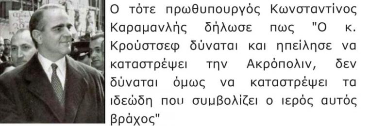 Συγκεκριμένα, 11 Αυγούστου απειλές κατά της Ελλάδας εκτόξευσε ο Νικίτα Χρουστσόφ κατά τη διάρκεια συγκέντρωσης για τη φιλία Ε.Σ.Σ.Δ.-Ρουμανίας στο Κρεμλίνο, στην οποία παρίστατο και ο Έλληνας πρέσβης. Απαντώντας σε απειλές του Σοβιετικού ηγέτη, ότι θα προβεί σε αφανισμό των χωρών-μελών της Ατλαντικής Συμμαχίας που φιλοξενούν βάσεις του ΝΑΤΟ, ο Έλληνας πρέσβης επισημαίνει ότι του φαίνεται αδιανόητο το ενδεχόμενο ο Ν. Χρουστσόφ να διατάξει την καταστροφή της Ακρόπολης. Η απάντηση είναι: Δεν θα διατάξω βομβαρδισμό της Ακρόπολης, αλλά των γύρω ελαιώνων και των βάσεων του ΝΑΤΟ στην Ελλάδα. Οι βόμβες δεν κάνουν διακρίσεις.