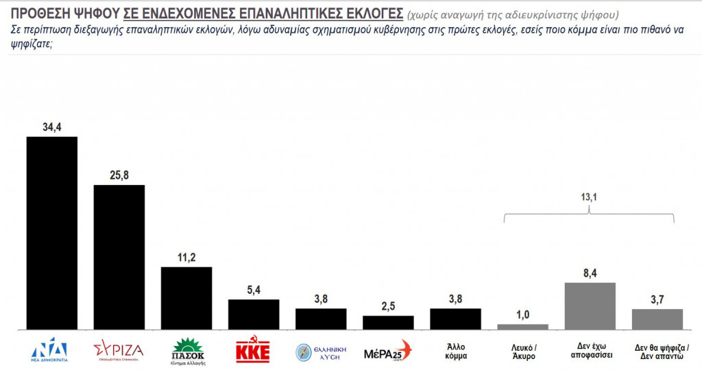 Σε ενδεχόμενες επαναληπτικές εκλογές, το 34,4% θα ψήφιζε ΝΔ, 25,8% ΣΥΡΙΖΑ, 11,2% ΠΑΣΟΚ και 5,4% ΚΚΕ.