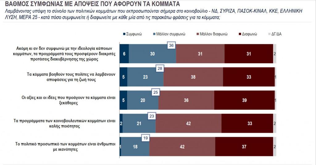 Αναφορικά με το ρόλο των κομμάτων στην κοινωνία, την αξία τους και το πόσο οι πολίτες τα εμπιστεύονται, βγαίνουν τα εξής συμπεράσματα: