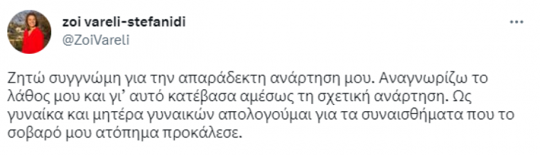 «Ζητώ συγγνώμη για την απαράδεκτη ανάρτηση μου. Αναγνωρίζω το λάθος μου και γι’ αυτό κατέβασα αμέσως τη σχετική ανάρτηση. Ως γυναίκα και μητέρα γυναικών απολογούμαι για τα συναισθήματα που το σοβαρό μου ατόπημα προκάλεσε».