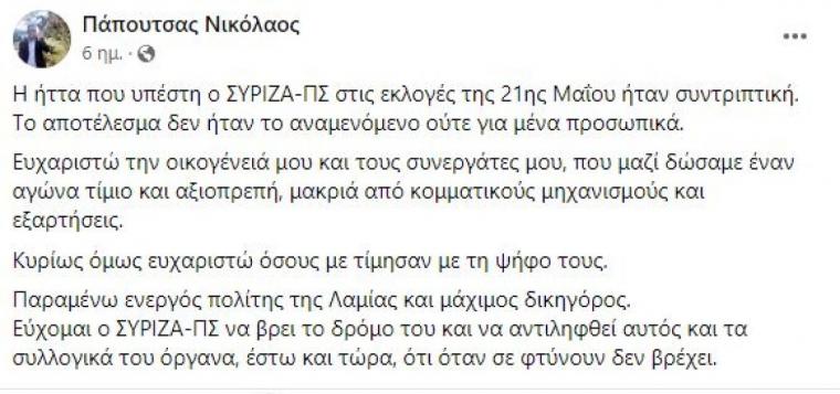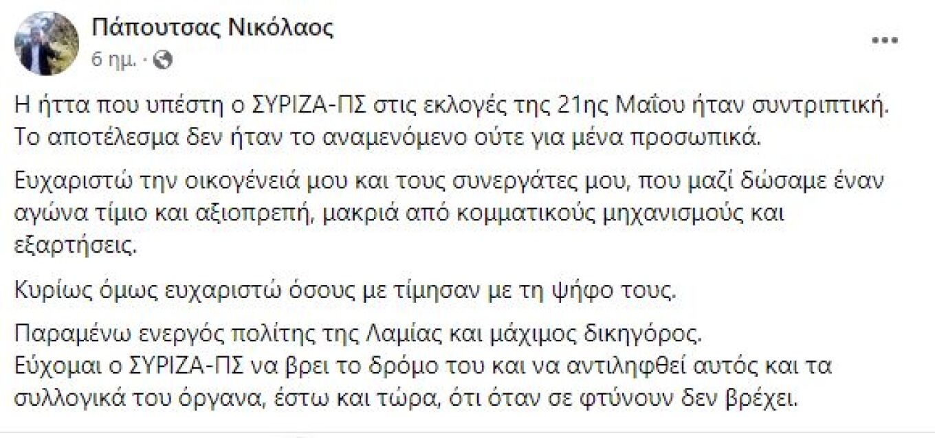 «H ήττα που υπέστη ο ΣΥΡΙΖΑ-ΠΣ στις εκλογές της 21ης Μαΐου ήταν συντριπτική. Το αποτέλεσμα δεν ήταν το αναμενόμενο ούτε για μένα προσωπικά. Ευχαριστώ την οικογένειά μου και τους συνεργάτες μου, που μαζί δώσαμε έναν αγώνα τίμιο και αξιοπρεπή, μακριά από κομματικούς μηχανισμούς και εξαρτήσεις. Κυρίως όμως ευχαριστώ όσους με τίμησαν με τη ψήφο τους. Παραμένω ενεργός πολίτης της Λαμίας και μάχιμος δικηγόρος. Εύχομαι ο ΣΥΡΙΖΑ-ΠΣ να βρει το δρόμο του και να αντιληφθεί αυτός και τα συλλογικά του όργανα, έστω και τώρα, ότι όταν σε φτύνουν δεν βρέχει».