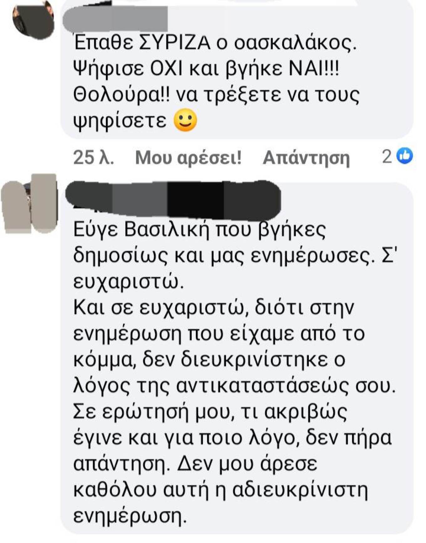 Η ίδια σε ανάρτησή της στο facebook υποστηρίζει πως όταν διαπίστωσε ότι δεν βρεθεί στην πρώτη θέση της λίστας επιχείρησε να επικοινωνήσει με την ηγεσία του κόμματός η οποία αντί της ρεαλιστικής δυνατότητας να εκλεγεί βουλευτής της αντιπρότεινε διορισμό ως επιστημονική συνεργάτης στη Βουλή.