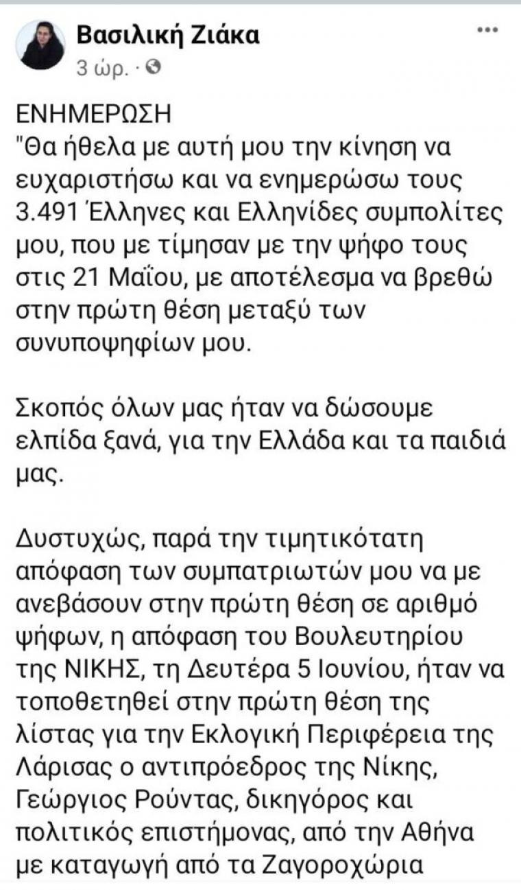 Δυστυχώς, παρά την τιμητικότατη απόφαση των συμπατριωτών μου να με ανεβάσουν στην πρώτη θέση σε αριθμό ψήφων, η απόφαση του Βουλευτηρίου της ΝΙΚΗΣ, τη Δευτέρα 5 Ιουνίου, ήταν να τοποθετηθεί στην πρώτη θέση της λίστας για την Εκλογική Περιφέρεια της Λάρισας ο αντιπρόεδρος της Νίκης, Γεώργιος Ρούντας, δικηγόρος και πολιτικός επιστήμονας, από την Αθήνα με καταγωγή από τα Ζαγοροχώρια Ηπείρου και την Κόρινθο.