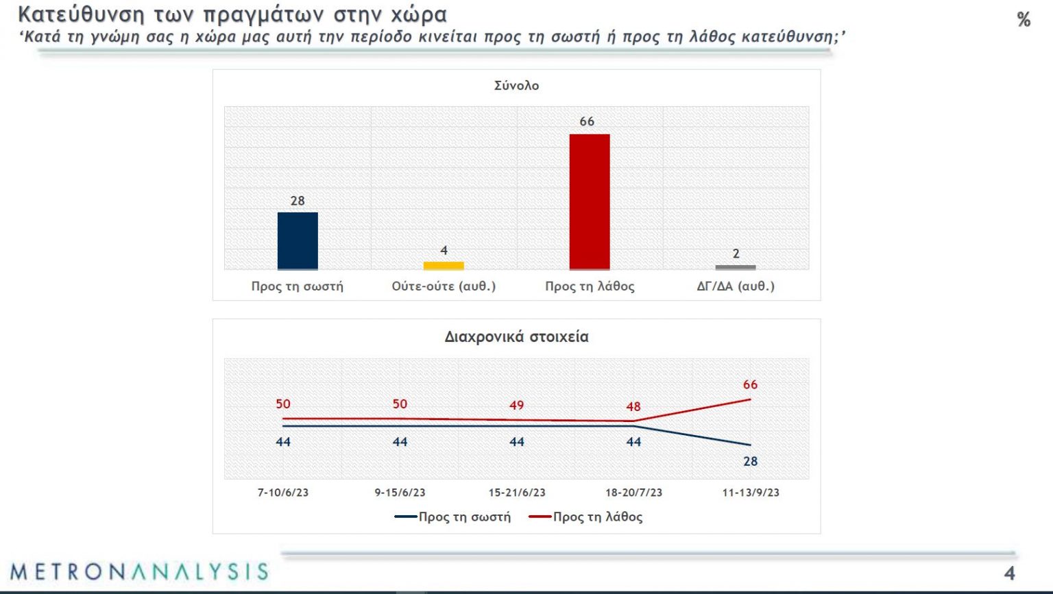Αυτή η δυσαρέσκεια για την κυβέρνηση και την ευρύτερη κοινωνική και πολιτική συνθήκη αποτυπώνεται σε έναν βασικό δείκτη, που είναι αυτός που αφορά το εάν τα πράγματα στη χώρα πηγαίνουν προς τη σωστή ή τη λάθος κατεύθυνση.