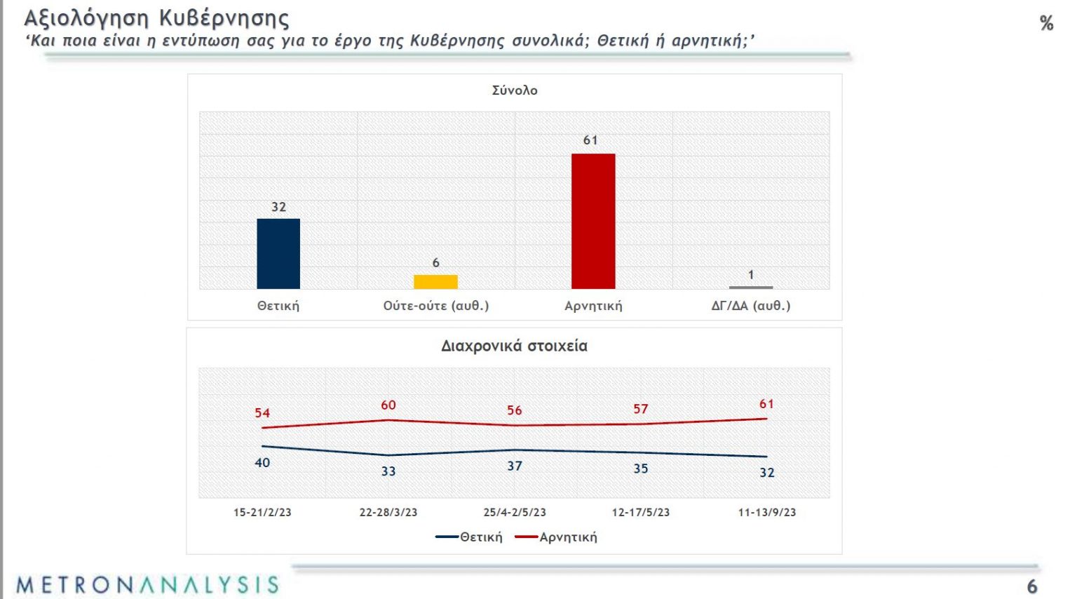 Όμως πέραν του γενικού κλίματος απαισιοδοξίας, υπάρχει και σαφής δυσαρέσκεια για την κυβέρνηση. Συγκεκριμένα το 61% έχει αρνητική γνώμη για την κυβέρνηση και μόνο το 32% έχει θετική γνώμη. Επιστρέφουμε, δηλαδή σε κλίμακα δυσαρέσκειας που είχαμε να δούμε από τον Μάρτιο και φαίνεται εν μέρει τουλάχιστον να αντιστρέφεται το κλίμα που είχε αποτυπωθεί τον Μάιο όταν οι θετικές γνώμες ήταν στο 37%.