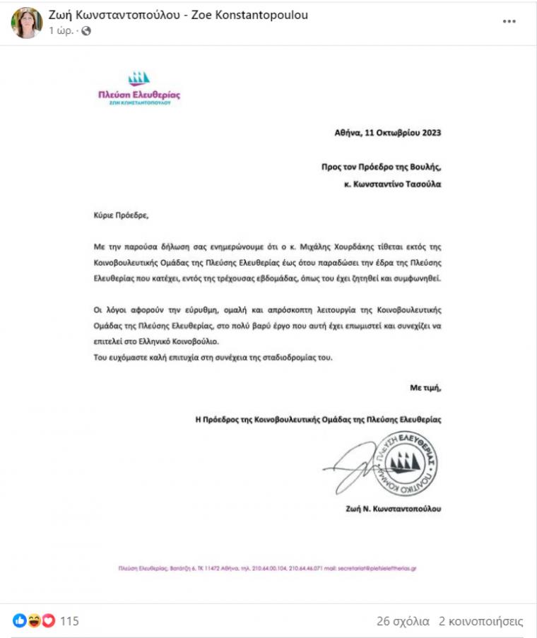 Νωρίτερα το μεσημέρι της Τετάρτης με επιστολή της προς τον Πρόεδρο της Βουλής Κωνσταντίνο Τασούλα, η επικεφαλής της Πλεύσης Ελευθερίας Ζωή Κωνσταντοπούλου, γνωστοποίησε την διαγραφή του βουλευτή της, Μιχάλη Χουρδάκη.