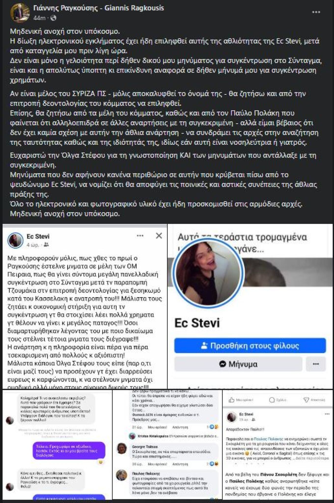 Στη Δίωξη Ηλεκτρονικού Εγκλήματος Αρχές προσέφυγε ο Γιάννης Ραγκούσης, εναντίον λογαριασμού σε social media με ψευδώνυμο, που διαδίδει πως δήθεν διοργανώνει «συγκέντρωση στο Σύνταγμα υπέρ του Στέφανου Τζουμάκα» και μάλιστα ζητάει λεφτά επ’ αυτού από τα μέλη του κόμματος, μέσω sms.