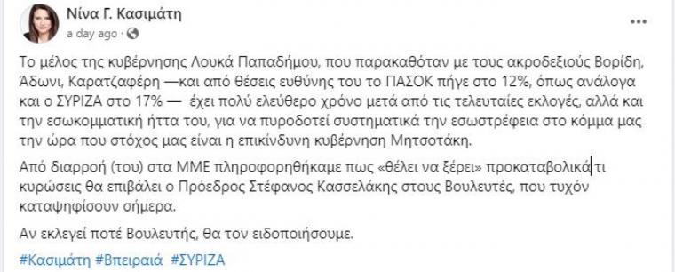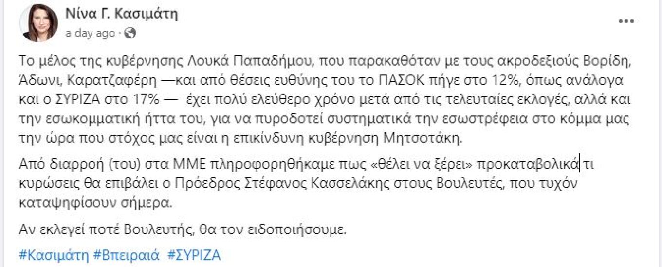 Η Νίνα Γ. Κασιμάτη θεώρησε ότι ο Γιάννης Ραγκούσης «έδειξε» εκείνη με αποτέλεσμα να ξεσπάσει εναντίον του μέσω των social media. Μεταξύ άλλων η κυρία Κασιμάτη είπε πως «όταν εκλεγεί βουλευτής» ο κ. Ραγκούσης «θα τον ειδοποιήσουμε». Μάλιστα χωρίς να τον κατονομάζει δήλωσε πως ο πρώην βουλευτής «πυροδοτεί την εσωστρέφεια στο κόμμα».
