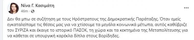 Η βουλευτής του ΣΥΡΙΖΑ δεν άφησε αναπάντητα τα όσα της καταλόγισε ο Γιάννης Ραγκούσης και έτσι το απόγευμα της Παρασκευής επανήλθε και πάλι μέσω των social media. «Δεν θα μπω σε συζήτηση με τους Ηρόστρατους της Δημοκρατικής Παράταξης. Όταν εμείς εγκαταλείπαμε τις θέσεις μας για να χτίσουμε τα μεγάλα κοινωνικά μέτωπα, αυτός καθύβριζε τον ΣΥΡΙΖΑ και έκαιγε το ιστορικό ΠΑΣΟΚ, τη χώρα και τα κεκτημένα της Μεταπολίτευσης για να κάθεται σε υπουργική καρέκλα δίπλα στους Βορίδηδες», ανέφερε χαρακτηριστικά.