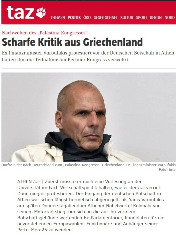 Oπως αναμεταδίδει η ελληνική σύνταξη της Deutsche Welle, σε περίπτωση που ο Γιάνης Βαρουφάκης, γραμματέας του κόμματος ΜέΡΑ25, είχε ταξιδέψει στη Γερμανία για να συμμετάσχει στη Διάσκεψη για την Παλαιστίνη στο Βερολίνο, πιθανότατα οι γερμανικές Αρχές θα τον είχαν υποχρεώσει να επιστρέψει πίσω στα σύνορα.