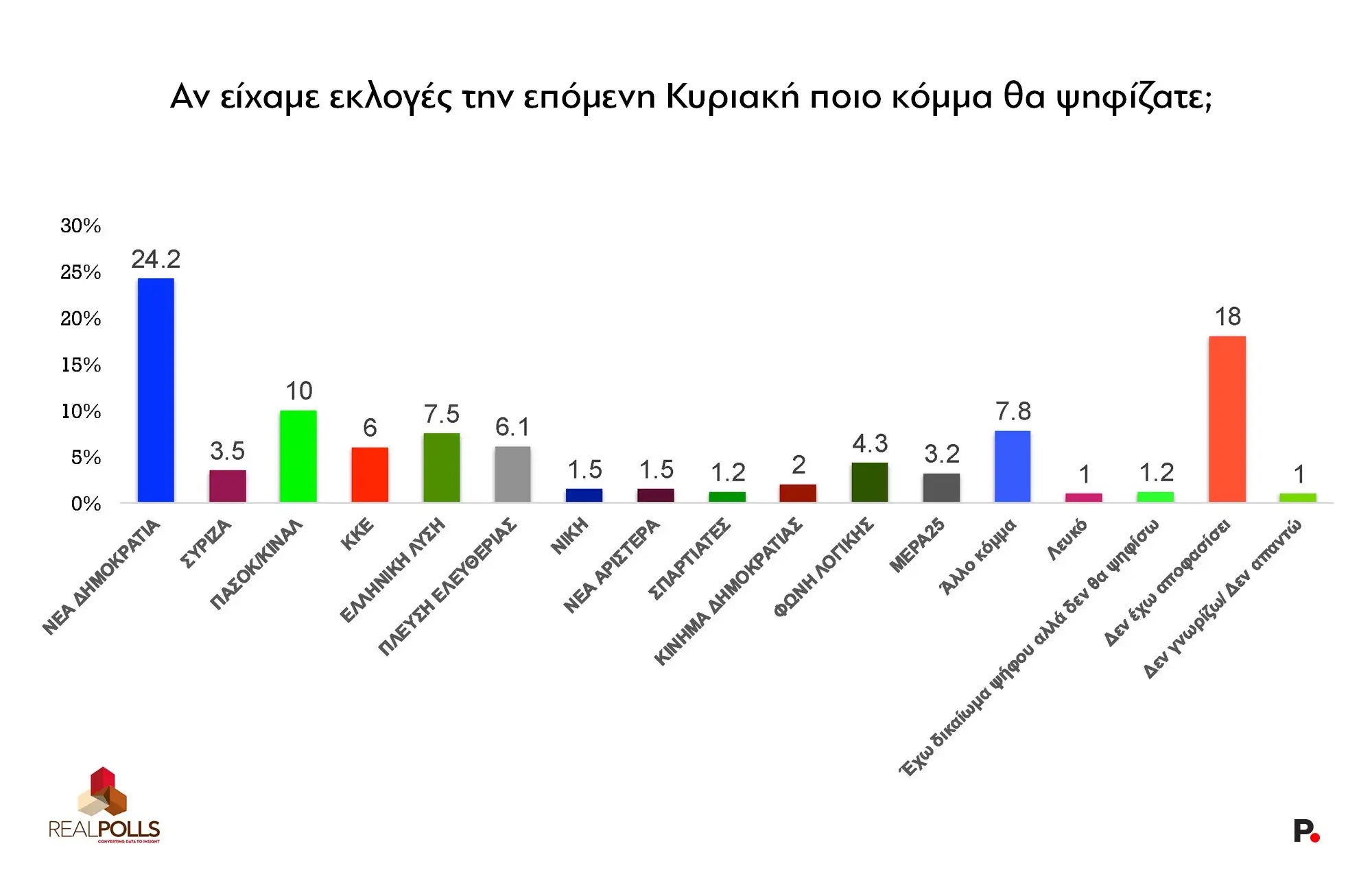 Στην πρόθεση ψήφου, η Νέα Δημοκρατία φτάνει το 24,2%, ενώ το ΠΑΣΟΚ-ΚΙΝΑΛ επιστρέφει σε διψήφιο ποσοστό, στο 10%, εμφανίζοντας σημαντική άνοδο σε σχέση με τον Οκτώβριο. Η κάμψη της Πλεύσης Ελευθερίας στο 6,1% επιτρέπει στην Ελληνική Λύση να αναδειχθεί σε τρίτη δύναμη με 7,5%, ενώ το ΚΚΕ σταθεροποιείται κοντά στο 6%. Ενδιαφέρον παρουσιάζει η άνοδος της Φωνής της Λογικής στο 4,3%, την ώρα που ΣΥΡΙΖΑ και ΜέΡΑ25 χάνουν έδαφος, κατρακυλώντας στο 3,5% και 3,2% αντίστοιχα. Παράλληλα, αυξάνεται τόσο η «αδιευκρίνιστη ψήφος» όσο και η πρόθεση για «Άλλο κόμμα», δείχνοντας ένα εκλογικό σώμα πιο ρευστό και επιφυλακτικό.
