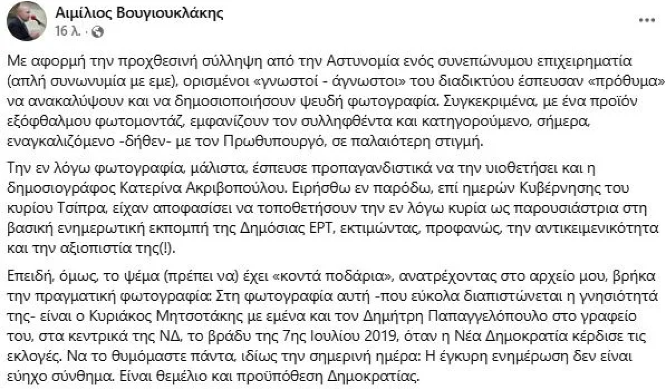«Με αφορμή την προχθεσινή σύλληψη από την Αστυνομία ενός συνεπώνυμου επιχειρηματία (απλή συνωνυμία με εμε), ορισμένοι «γνωστοί - άγνωστοι» του διαδικτύου έσπευσαν «πρόθυμα» να ανακαλύψουν και να δημοσιοποιήσουν ψευδή φωτογραφία. Συγκεκριμένα, με ένα προϊόν εξόφθαλμου φωτομοντάζ, εμφανίζουν τον συλληφθέντα και κατηγορούμενο, σήμερα, εναγκαλιζόμενο -δήθεν- με τον Πρωθυπουργό, σε παλαιότερη στιγμή.