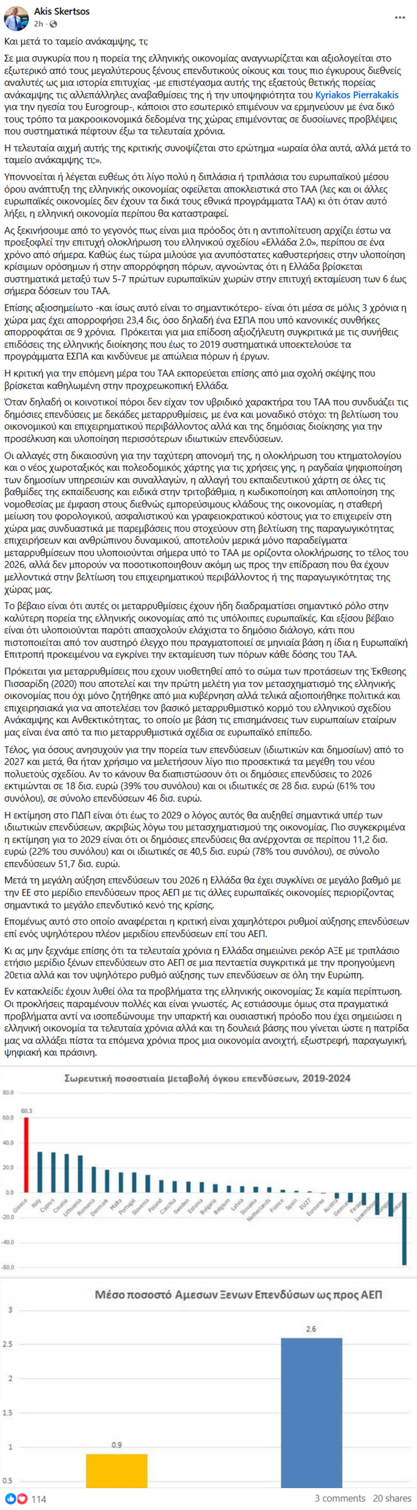 Τέλος, αναφορικά με όσους εκφράζουν ανησυχίες για την πορεία των επενδύσεων μετά το 2027, ο υπουργός Επικρατείας σημειώνει πως «θα ήταν χρήσιμο να εξετάσουν προσεκτικότερα τα μεγέθη του νέου πολυετούς σχεδίου. Θα διαπιστώσουν ότι οι δημόσιες επενδύσεις το 2026 εκτιμώνται σε 18 δισ. ευρώ (39% των συνολικών) και οι ιδιωτικές σε 28 δισ. ευρώ (61% των συνολικών), σε σύνολο επενδύσεων 46 δισ. ευρώ. Σύμφωνα με το ΠΔΠ, έως το 2029 ο λόγος αυτός θα μεταβληθεί σημαντικά υπέρ των ιδιωτικών επενδύσεων λόγω του μετασχηματισμού της οικονομίας. Πιο συγκεκριμένα, για το 2029 οι δημόσιες επενδύσεις εκτιμώνται σε περίπου 11,2 δισ. ευρώ (22%) και οι ιδιωτικές σε 40,5 δισ. ευρώ (78%), σε συνολικό ύψος 51,7 δισ. ευρώ. Μετά την ισχυρή άνοδο των επενδύσεων το 2026, η Ελλάδα θα έχει συγκλίνει σε μεγάλο βαθμό με την ΕΕ στο μερίδιο επενδύσεων προς ΑΕΠ, περιορίζοντας αισθητά το επενδυτικό κενό της κρίσης. Επομένως, η κριτική αφορά ουσιαστικά χαμηλότερους ρυθμούς αύξησης επενδύσεων πάνω σε ήδη υψηλότερο σημείο αφετηρίας. Ας μην ξεχνάμε, επίσης, ότι τα τελευταία χρόνια η Ελλάδα σημειώνει ρεκόρ Άμεσων Ξένων Επενδύσεων, με τριπλάσιο ετήσιο μερίδιο στο ΑΕΠ μέσα σε πενταετία σε σύγκριση με την προηγούμενη 20ετία, αλλά και με τον υψηλότερο ρυθμό αύξησης επενδύσεων στην Ευρώπη».