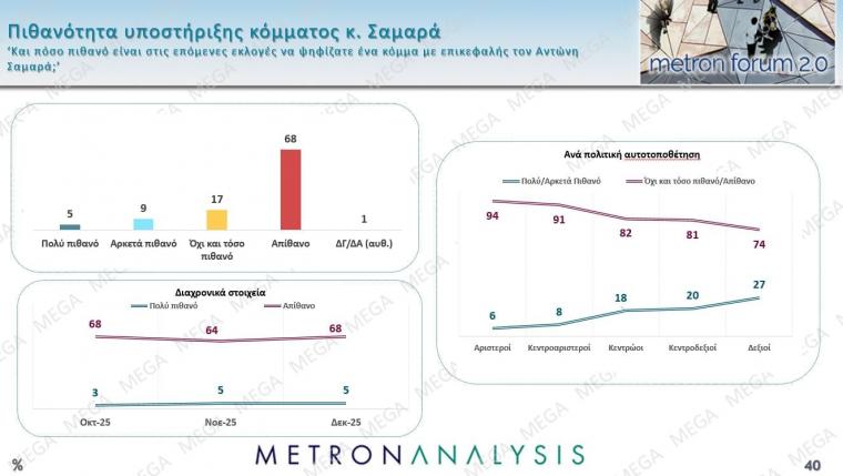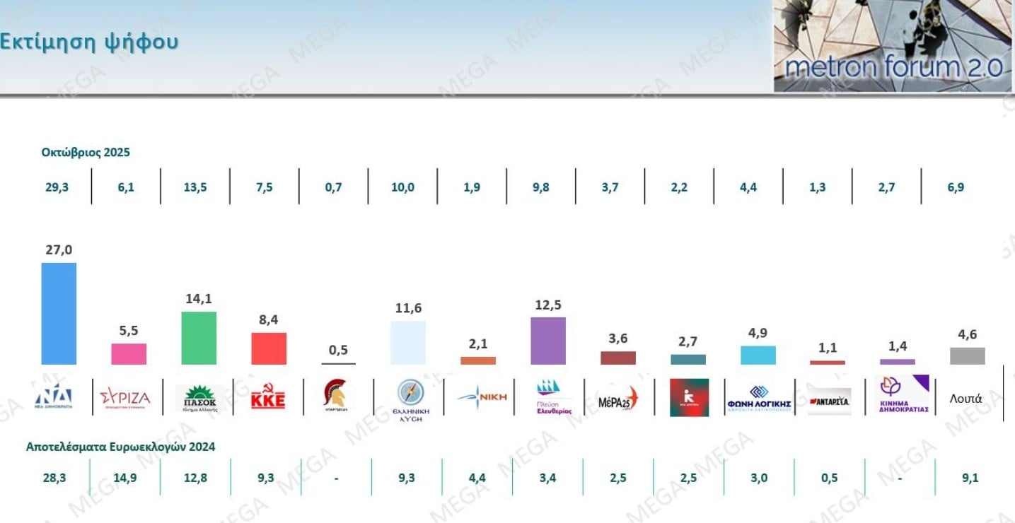 Σύμφωνα με την έρευνα της Metron Analysis, για λογαριασμό του Mega, στην πρόθεση ψήφου η ΝΔ είναι στο 21%, το ΠΑΣΟΚ 11%, η Πλεύση Ελευθερίας 9,7%, η Ελληνική Λύση 9%, το ΚΚΕ 6,5%, ο ΣΥΡΙΖΑ 4,2%, η Φωνή Λογικής 3,8%, το ΜέΡΑ25 2,8% η Νέα Αριστερά 2,1%, η Νίκη 1,6%, το Κίνημα Δημοκρατίας 1,1%, η ΑΝΤΑΡΣΥΑ 0,8%, οι Σπαρτιάτες 0,4%, ενώ το Σύνολο της Αδιευκρίνιστης Ψήφου είναι στο 11,6%.