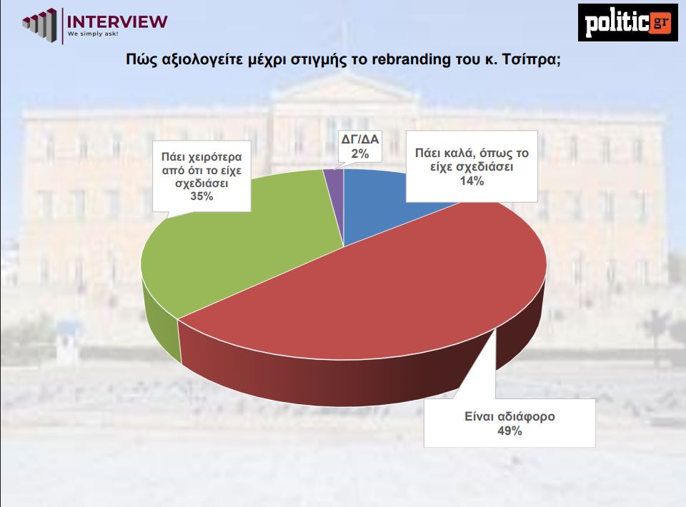 Σύμφωνα με τα ευρήματα της έρευνας, το rebranding του Αλέξη Τσίπρα δεν φαίνεται μέχρι στιγμής να δημιουργεί ισχυρό αποτύπωμα στο εκλογικό σώμα. Σχεδόν οι μισοί ερωτώμενοι (49%) δηλώνουν ότι το αξιολογούν ως αδιάφορο, ενώ ένα επιπλέον 35% εκτιμά ότι εξελίσσεται χειρότερα από ό,τι είχε σχεδιαστεί, με μόλις το 14% να θεωρεί ότι «πάει καλά».