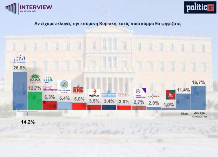 Συγκεκριμένα, με 26,9% παραμένει πρώτη η Νέα Δημοκρατία, ανοίγοντας τη χρονιά με ενίσχυση ποσοστών αλλά χωρίς ανατροπή της γενικής εικόνας. Οι αναποφάσιστοι παραμένουν σε υψηλά επίπεδα (16,7%), ενώ το ΠΑΣΟΚ διατηρεί τη δεύτερη θέση ενισχύοντας το ποσοστό του στο 12,7%.