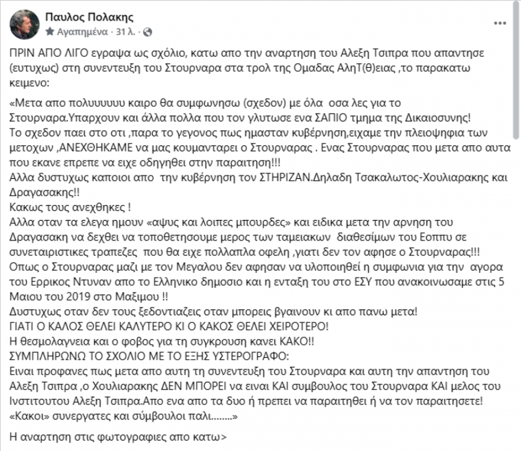 Στην σκιά των εξελίξεων αυτών ο Παύλος Πολάκης σχολίασε κάτω από την ανάρτηση του Αλέξη Τσίπρα λέγοντάς του πως συμφωνεί για πρώτη φορά μετά από πολύ καιρό με όσα έγραψε ο πρώην πρωθυπουργός, αφήνοντας ωστόσο αιχμές για την συνεργασία του με τον κ. Χουλιάρακη.
