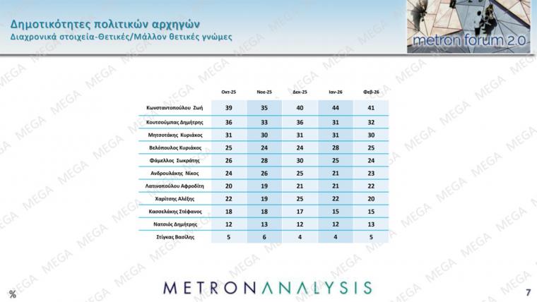 Η μεγάλη άνοδος του ποσοστού της «γκρίζας ζώνης» (αναποφάσιστοι και «δεν απαντώ») που φτάνει το 15,2% από 11,7% τον Ιανουάριο, κυριαρχεί στην μέτρηση της Metron Analysis που παρουσιάστηκε στο κεντρικό δελτίο του Mega. Η εξέλιξη αυτή καθορίζει την εκτίμηση ψήφου, καθώς η ΝΔ με απώλεια σχεδόν μίας μονάδας στην πρόθεση ψήφου, διευρύνει το προβάδισμά της έναντι του ΠΑΣΟΚ και φτάνει στο 29,4% από 28,5% τον προηγούμενο μήνα.