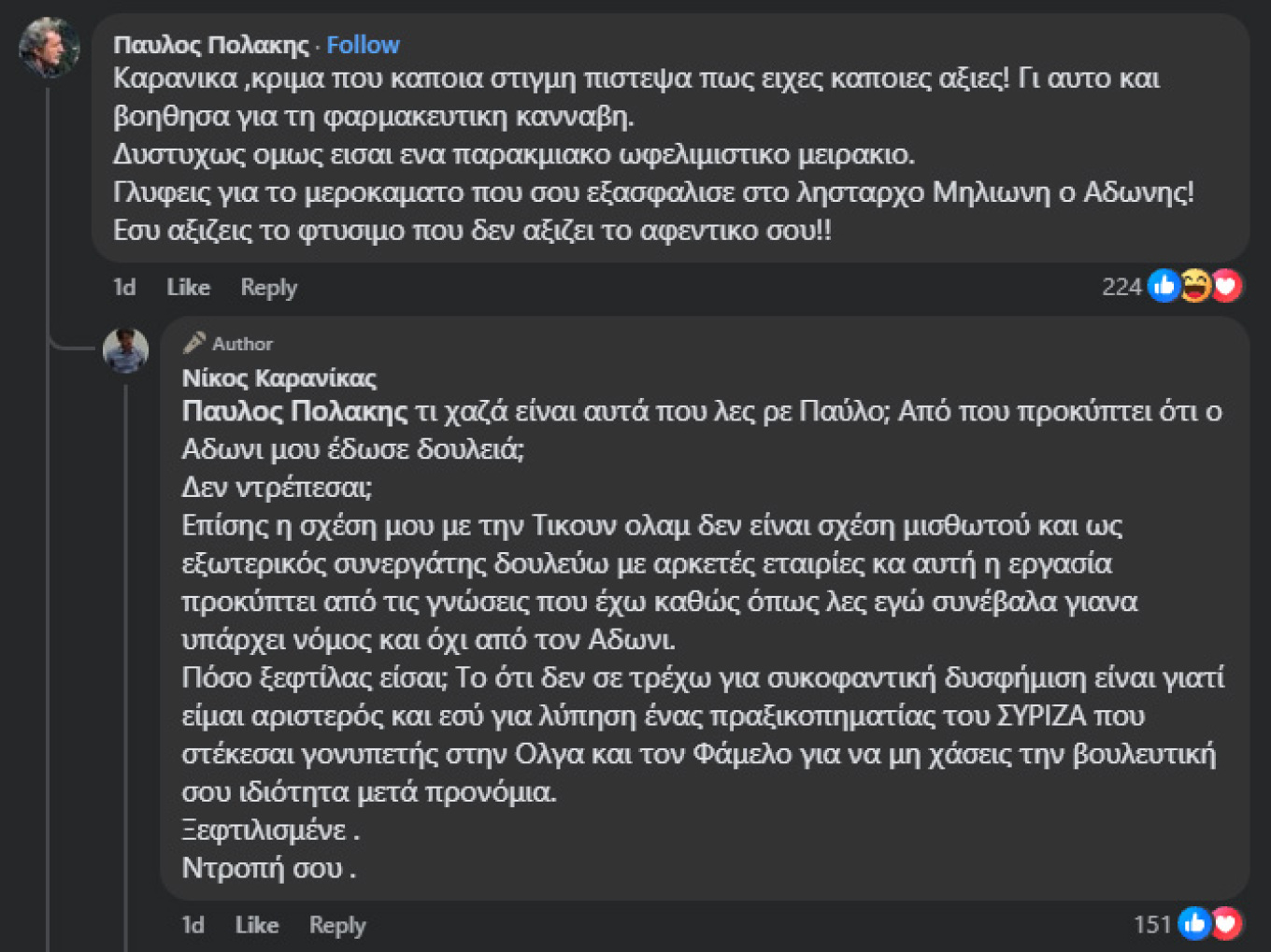 Αυτή η τοποθέτηση προκάλεσε την αντίδραση του Παύλου Πολάκη, ο οποίος σχολίασε κάτω από την ανάρτηση του Καρανίκα χαρακτηρίζοντάς τον «παρακμιακό ωφελιμιστικό μειράκιο» και κατηγορώντας τον ότι «γλείφει» τον Άδωνι Γεωργιάδη επειδή καταδίκασε τη βία και επιτέθηκε σε αυτό που περιέγραψε ως «αριστερούς τραμπούκους». Παράλληλα, άφησε αιχμές για την επαγγελματική δραστηριότητα του Καρανίκα στον χώρο της φαρμακευτικής κάνναβης.