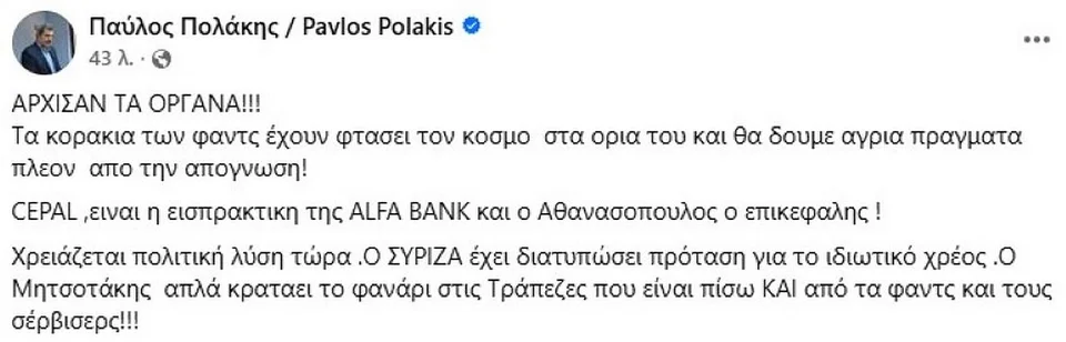 Χρειάζεται πολιτική λύση τώρα .Ο ΣΥΡΙΖΑ έχει διατυπώσει πρόταση για το ιδιωτικό χρέος. Ο Μητσοτάκης απλά κρατάει το φανάρι στις Τράπεζες που είναι πίσω ΚΑΙ από τα φαντς και τους σέρβισερς!!!».
