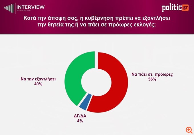 Το 56% των ερωτηθέντων θέλει πρόωρες εκλογές, έναντι του 40% που προτιμά την εξάντληση της κυβερνητικής θητείας, ενώ το 4% δεν εκφράζει άποψη.