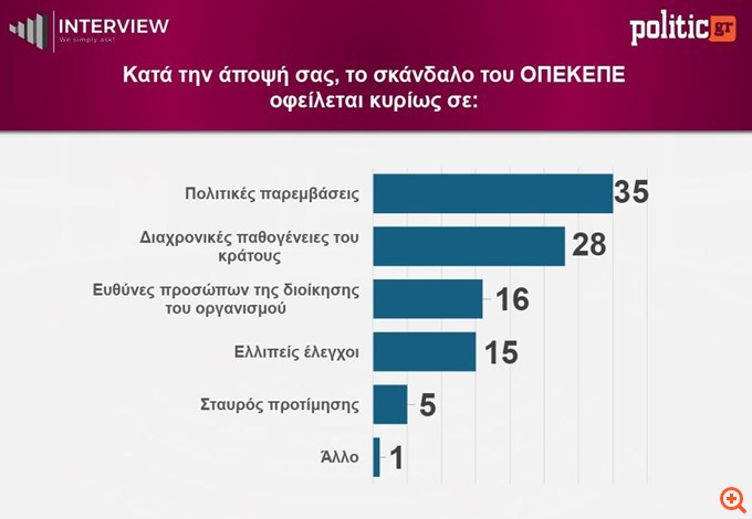 Οι πολίτες αποδίδουν την ευθύνη για το σκάνδαλο του ΟΠΕΚΕΠΕ πρωτίστως σε πολιτικές παρεμβάσεις. Συγκεκριμένα, το 35% θεωρεί ότι το ζήτημα προκύπτει από πολιτικές παρεμβάσεις, ενώ το 28% το συνδέει με διαχρονικές παθογένειες του κράτους.
