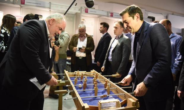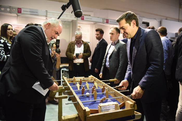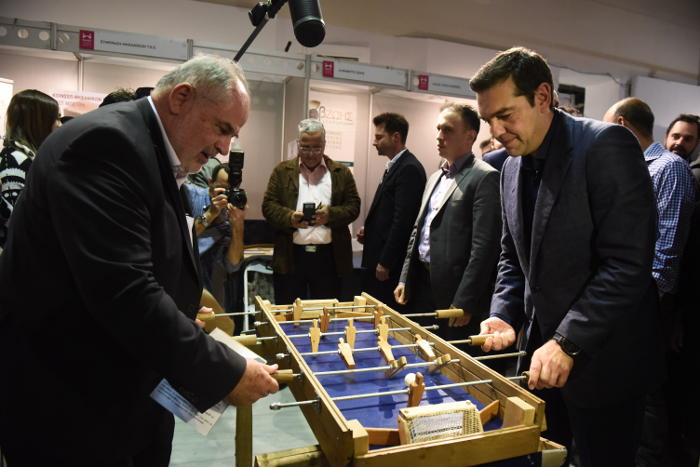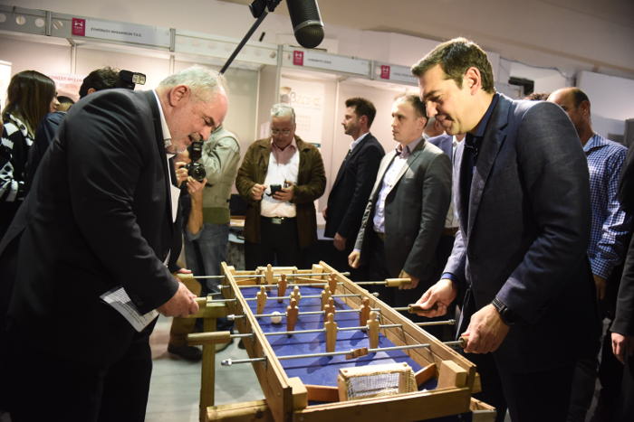 Ο πρωθυπουργός μάλιστα κατά τη διάρκεια της επίσκεψης του στους χώρους της Εκθεσης στάθηκε σε ένα ξύλινο ποδοσφαιράκι και κατόπιν πρόσκλησης των υπευθύνων έπαιξε.