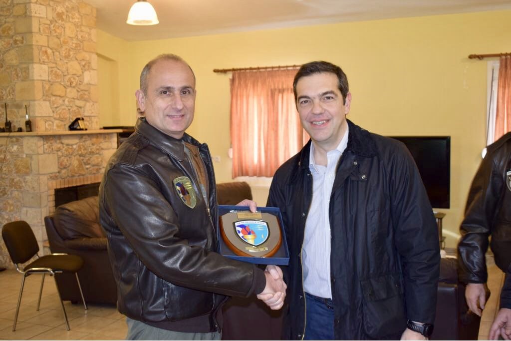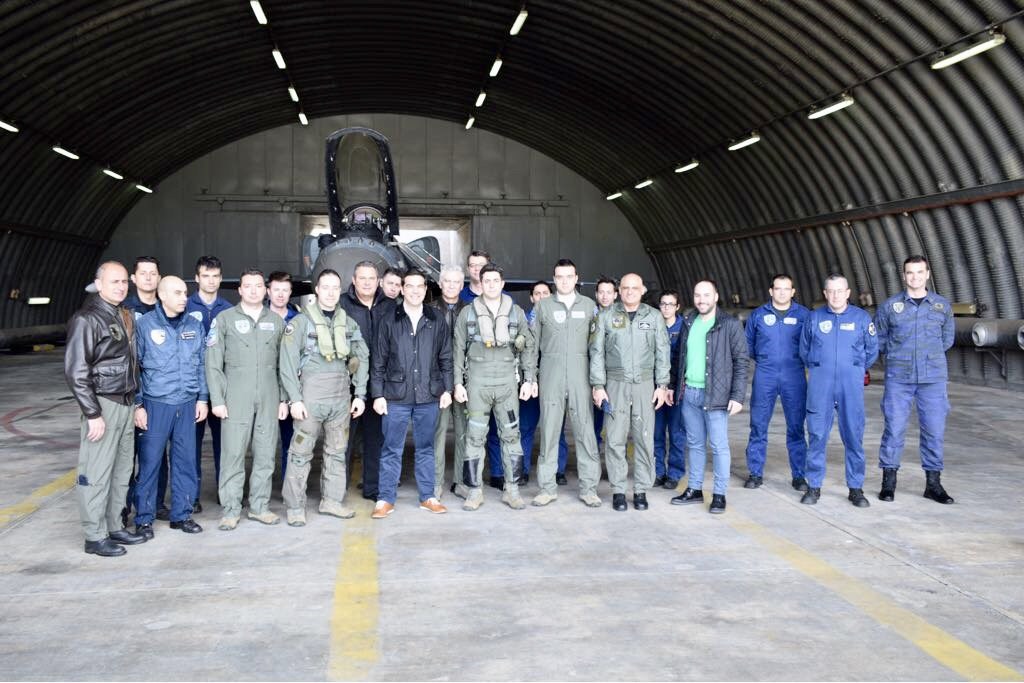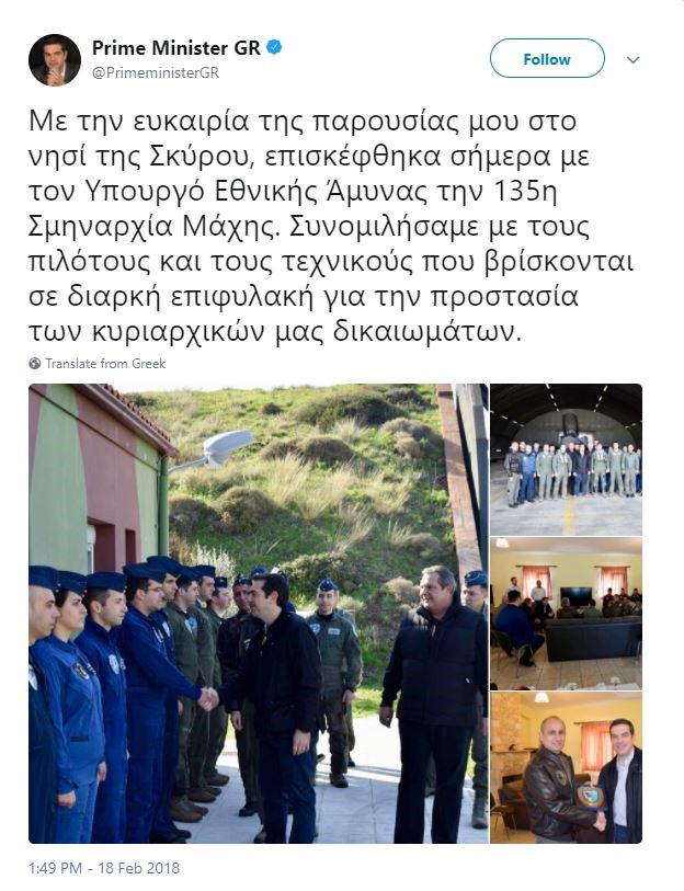 «Συνομιλήσαμε με τους πιλότους και τους τεχνικούς που βρίσκονται σε διαρκή επιφυλακή για την προστασία των κυριαρχικών μας δικαιωμάτων», έγραψε ο πρωθυπουργός, Αλέξης Τσίπρας, στο twitter για την επίσκεψη που έκανε μαζί με τον υπουργό Εθνικής Άμυνας, Πάνο Καμμένο, στην 135η Σμηναρχία Μάχης της Πολεμικής Αεροπορίας στη Σκύρο.