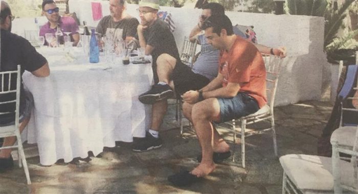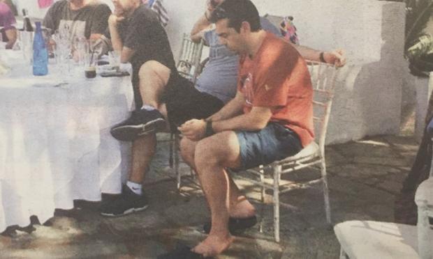 Το ένθετο Secret δημοσιεύει φωτογραφία του Αλέξη Τσίπρα από την αυλή του σπιτιού κατά τη διάρκεια του πάρτι. Με καλοκαιρινή διάθεση και ιδιαίτερα άνετος με τους υπόλοιπους γονείς των παιδιών εμφανίστηκε με χαλαρό μπλουζάκι και βερμούδα ενώ φορούσε crocks. Βέβαια, δεν σταμάτησε καθόλου να κοιτά το κινητό αφού η γιορτή αυτή έγινε με φόντο το Σκοπιανό.