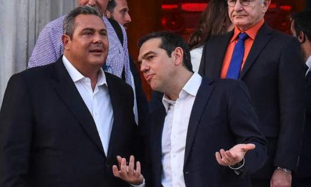 Τόσο ο πρωθυπουργός όσο και ο πρόεδρος των ΑΝΕΛ και υπουργός Αμυνας προσήλθαν με γραβάτες στο Ζάππειο, για την πανηγυρική συνεδρίαση των κοινοβουλευτικών ομάδων ΣΥΡΙΖΑ και ΑΝΕΛ. Ο μεν κ. Τσίπρας επέλεξε βαθύ κόκκινο, ο δε κ. Καμμένος μπλε.
