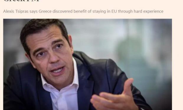 Ο πρωθυπουργός υπογραμμίζει στους Financial Times ότι η Ελλάδα έμαθε με τον πιο σκληρό τρόπο ότι είναι προς το εθνικό συμφέρον η παραμονή στην ευρωζώνη και στην ΕΕ. Καλεί μάλιστα τους αναγνώστες των FT να φανταστούν τι δυσκολίες θα αντιμετώπιζε η Ελλάδα σε διαφορετική περίπτωση, όταν η μεγάλη δύναμη του Ηνωμένου Βασιλείου αντιμετωπίζει τόσες δυσκολίες με το Brexit.