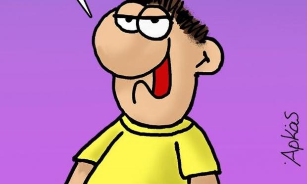 Σχολιάζοντας με αιχμηρό τρόπο τα γλωσσικά ατοπήματα και την auto-translate αγγλική του πρωθυπουργού, ο μικρός πρωταγωνιστής των σκίτσων: αναφωνεί: «Δεν είναι η μέρα μου σήμερα».
