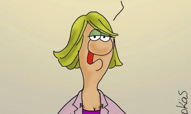 Στο σκίτσο απεικονίζεται μια παρουσιάστρια ειδήσεων η οποία... μεταφέρει τις ελαφρώς... αντικρουόμενες απόψεις του υπουργού για τις περικοπές: Πρώτον, η κυβέρνηση δεν τις μείωσε δεύτερον, μας ανάγκασαν οι ξένοι και τρίτον, εσείς τις είχατε μειώσει περισσότερο!