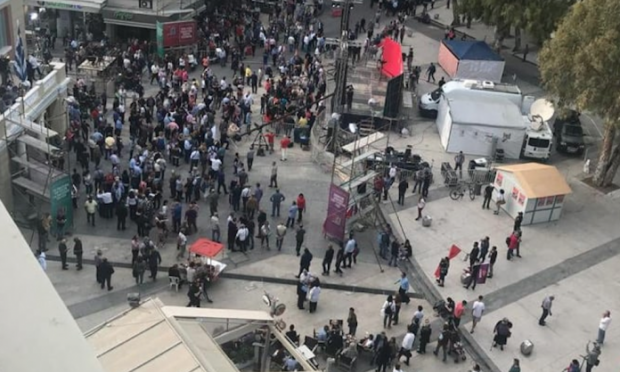 Μάλιστα, είπαν στα μικρόφωνα ότι περιμένουν να κλείσουν τα μαγαζιά για να ξεκινήσει η ομιλία του Αλέξη Τσίπρα…