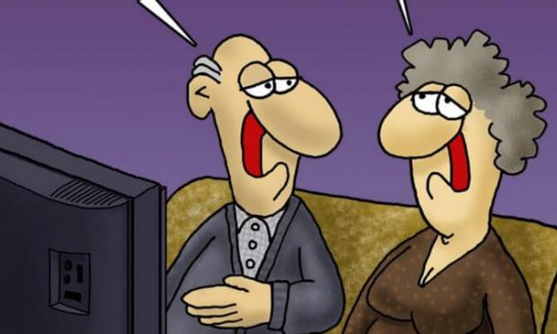 Ο γνωστός σκιτσογράφος εμφανίζει ένα ζευγάρι που κάθεται μπροστά στην τηλεόραση.