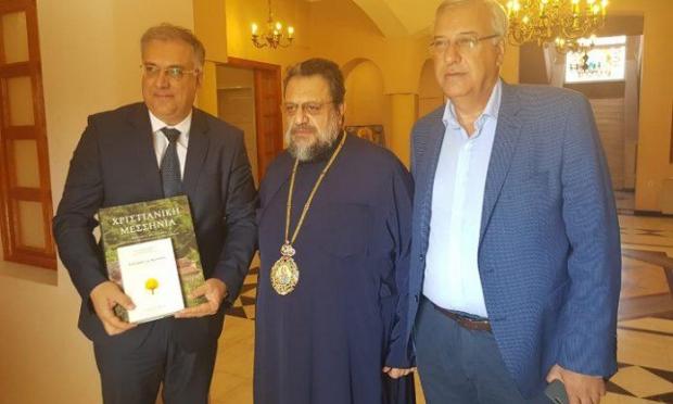 Ο κ. Χρυσόστομος εξέφρασε την ελπίδα ότι θα πάνε όλα καλά για την πατρίδα μας και την κοινωνία και προσέφερε στον Υπουργό ένα βιβλίο του Νομού Μεσσηνίας.