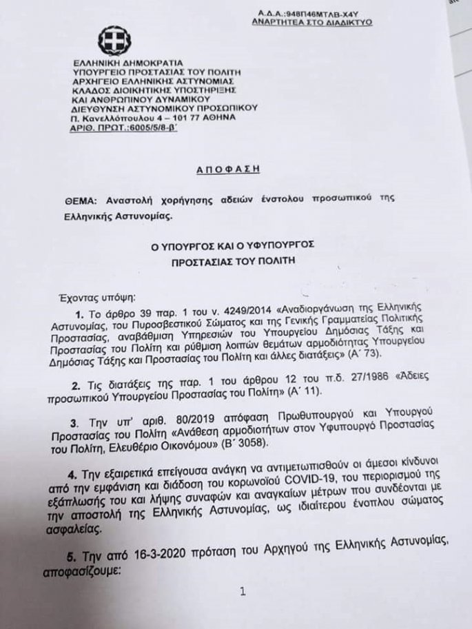 «Έχοντας υπόψη: 1. Την εξαιρετικά επείγουσα ανάγκη να αντιμετωπιστούν οι άμεσοι κίνδυνοι από την εμφάνιση και διάδοση του κορωνοϊού, του περιορισμού της εξάπλωσής του και λήψης συναφών και αναγκαίων μέτρων που συνδέονται με την αποστολή της Αστυνομίας, ως ιδιαίτερου ένοπλου σώματος ασφαλείας.