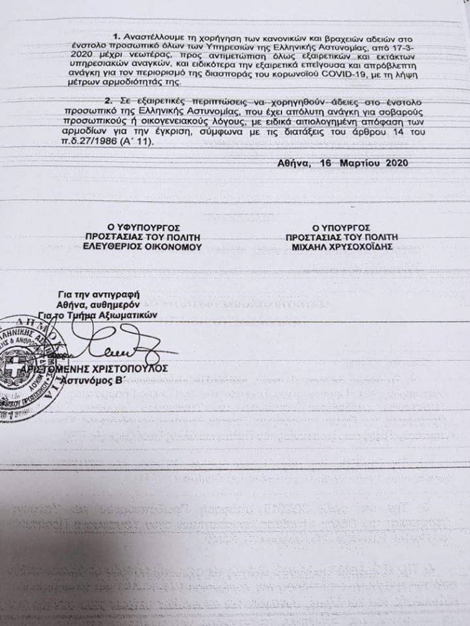 Αναστέλλουμε τη χορήγηση των κανονικών και βραχειών αδειών στο ένστολο προσωπικό όλων των υπηρεσιών της Αστυνομίας από 17 Μαρτίου 2020 μέχρι νεωτέρας, προς αντιμετώπιση εξαιρετικών και εκτάκτων υπηρεσιακών αναγκών και ειδικότερα την εξαιρετικά επείγουσα και απρόβλεπτη ανάγκη για τον περιορισμό της διασποράς του Covid -19 με τη λήψη μέτρων αρμοδιότητάς της.