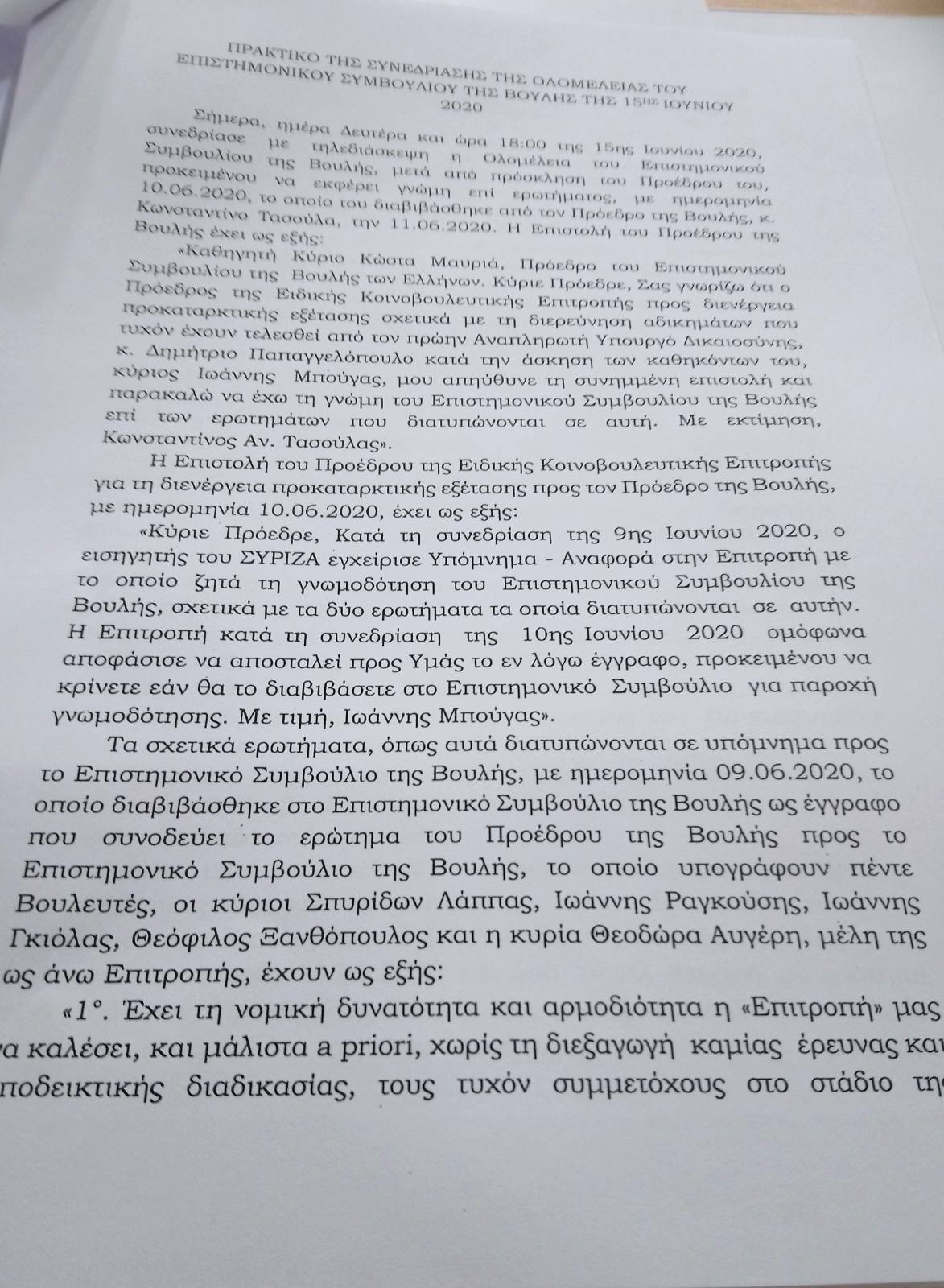 Υπενθυμίζεται ότι το ερώτημα είχε τεθεί στο Επιστημονικό Συμβούλιο με αφορμή την απόφαση της πλειοψηφίας να καλέσει ως υπόπτους τη δημοσιογράφο Γιάννα Παπαδάκου, τον εκδότης Γιάννη Φιλιππάκη και τον συνεργάτη του Αλέξανδρο Τάρκα, πυροδοτώντας έντονες αντιδράσεις του ΣΥΡΙΖΑ, που θεώρησε ότι κάτι τέτοιο αντίκειται στο νόμο περί ευθύνης υπουργών.