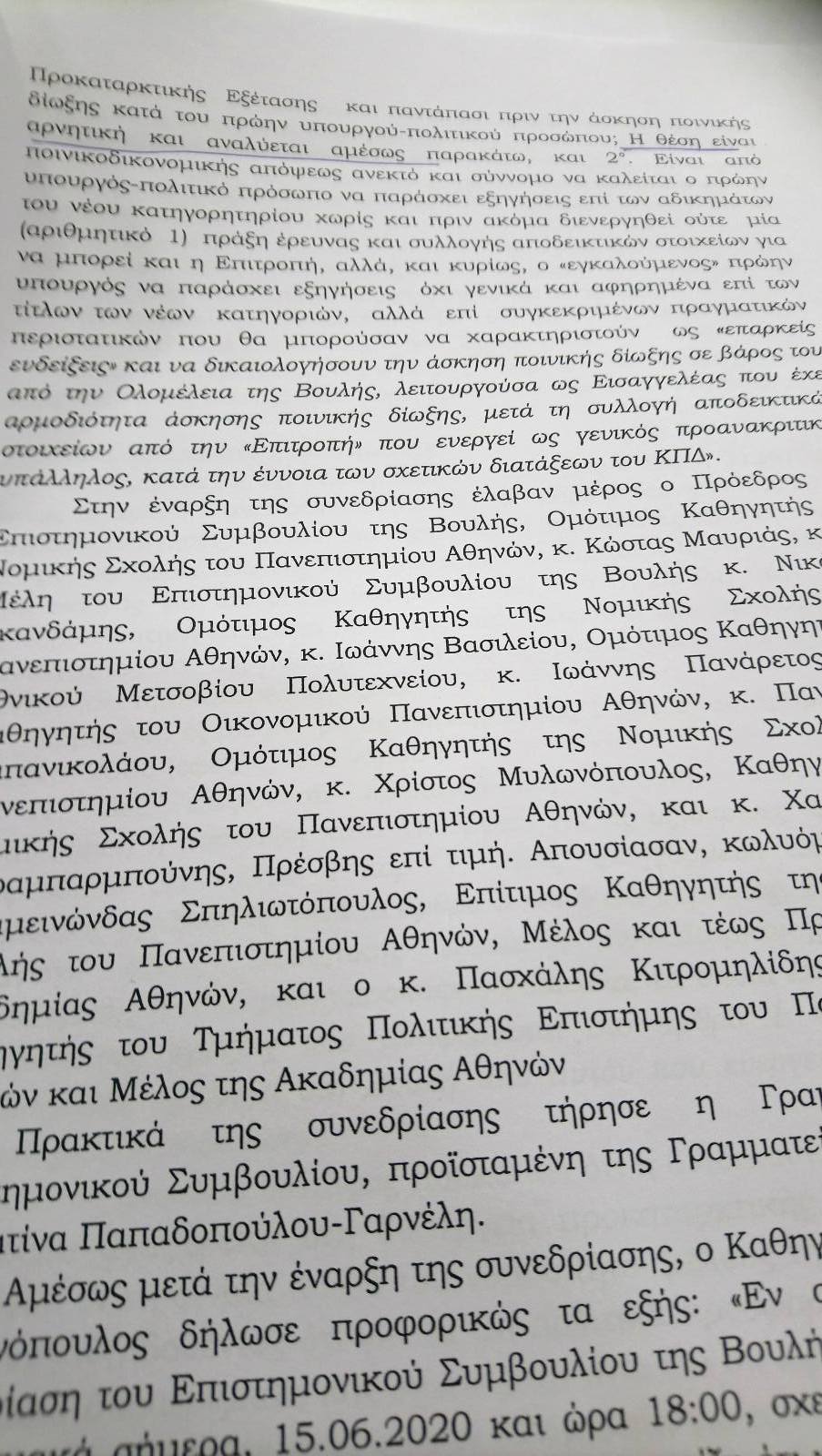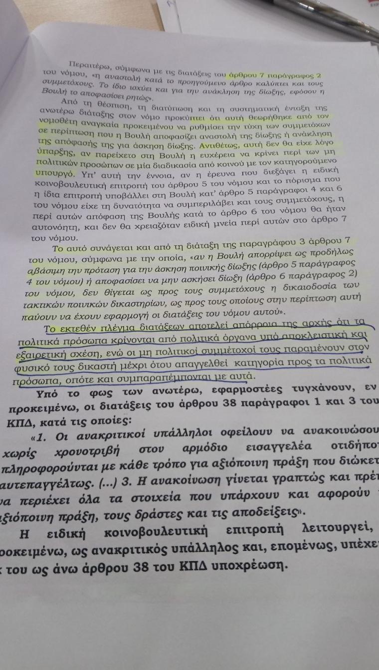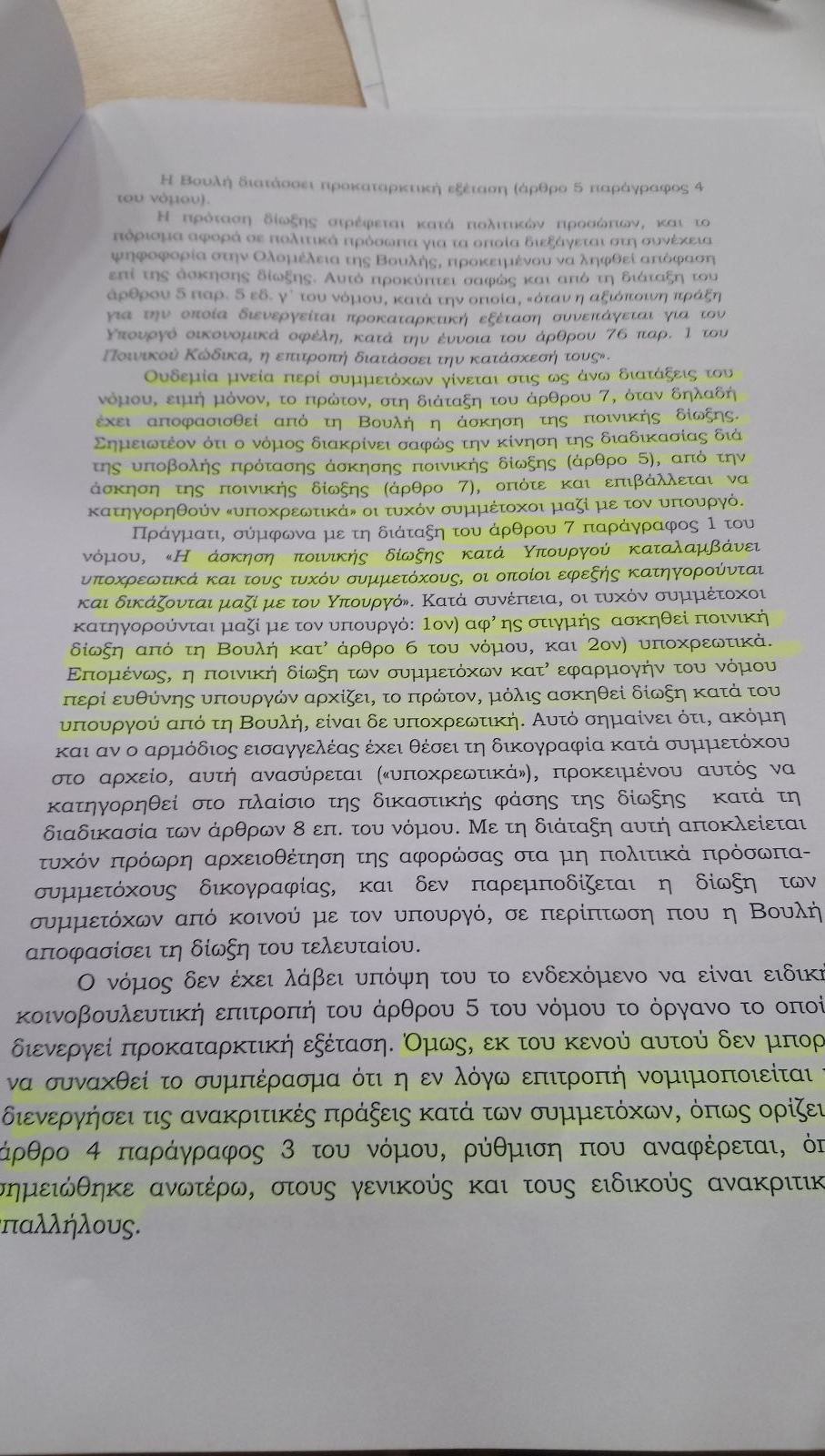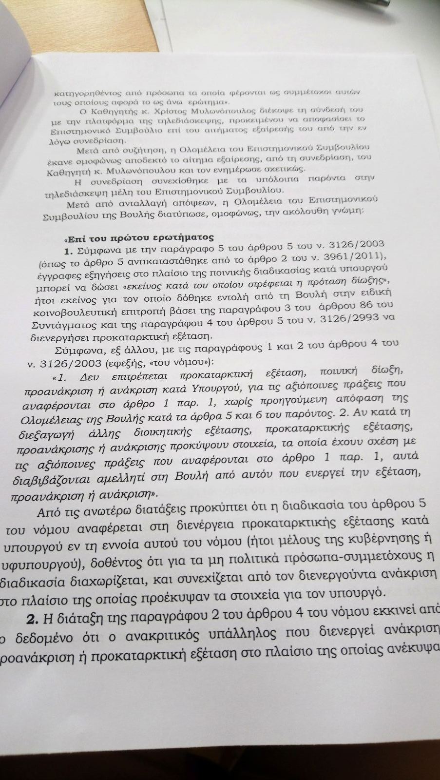 Η γνωμοδότηση αναφέρει χαρακτηριστικά ότι για φυσικά πρόσωπα δεν νοείται καμία ανακριτική πράξη σε βάρος τους από την Επιτροπή, δίνοντας περιθώριο μόνο για την υπόδειξή τους ως υπόπτων, προκειμένου να κρίνει μετά το Δικαστικό Συμβούλιο.