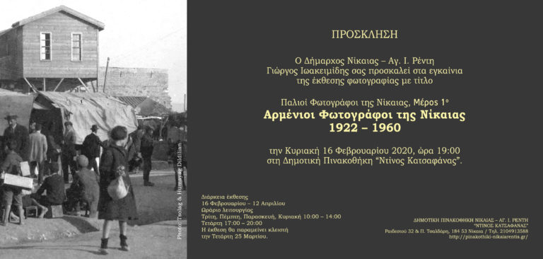 «Αρμένιοι φωτογράφοι της Νίκαιας 1922-1960» είναι ο τίτλος έκθεσης φωτογραφίας που θα παρουσιαστεί στη Δημοτική Πινακοθήκη Νίκαιας – Αγ. Ι. Ρέντη «Ντίνος Κατσαφάνας» από τις 16 Φεβρουαρίου έως τις 12 Απριλίου 2020. Τα εγκαίνια θα πραγματοποιηθούν την Κυριακή 16 Φεβρουαρίου, και ώρα 19.00.