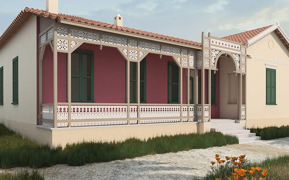 «Πρόκειται για μικρής κλίμακας κτήριο με σαφείς αναφορές στο γραφικό στιλ της ευρωπαϊκής αρχιτεκτονικής εξοχικών κατοικιών των μέσων του 19ου αι. Το κτήριο με μικτό εμβαδόν 198 τ.μ., είναι μονώροφο, κεραμοσκεπές και ελαφρά υπερυψωμένο από το έδαφος. Αποτελείται από ένα μεγάλο καθιστικό με τζάκι και σε διάταξη -αριστερά και δεξιά- βρίσκονται τέσσερα μεγάλα, ψηλοτάβανα δωμάτια, στα οποία διατηρούνται τα αρχικά χρώματα και οροφοδιακόσμηση. Υπάρχουν οι βοηθητικοί χώροι. Είναι υπερυψωμένη κατά ένα μέτρο από το έδαφος, πράγμα που της εξασφάλιζε στεγανότητα. Οι κορμοί -αγιορείτικη καστανιά- πάνω στους οποίους εδράζεται το οικοδόμημα παραμένουν άθικτοι. Το στυλ αυτό διαδόθηκε μέσω πολλών έντυπων εκδόσεων οι οποίες κυκλοφόρησαν ευρέως στην Ευρώπη και στην Αμερική. Ειδικότερα, στο συγκεκριμένο αρχιτεκτόνημα διακρίνουμε τις επιρροές αυτές με βάση τόσο την πολύπλοκη διαμόρφωση της κάτοψης όσο και τις επιμέρους διακοσμητικές μορφές, που βασίζονται κυρίως στη χρήση διάτρητων ξύλινων στοιχείων, τα οποία κοσμούν ως δαντέλλα την κύρια όψη της οικίας. Περιβάλλεται από μεγάλο κήπο.