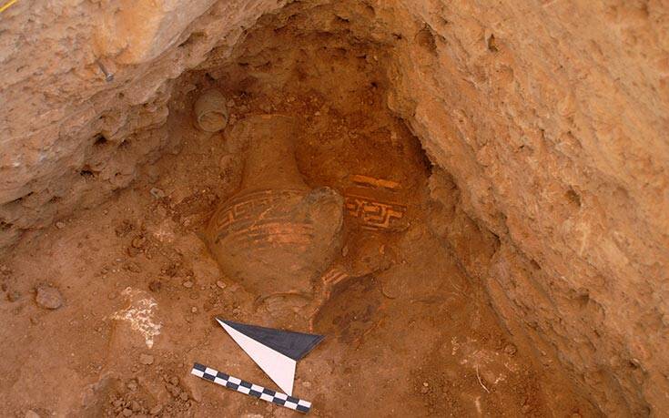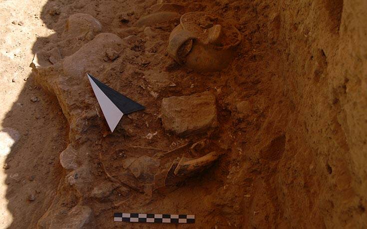 Αγγεία πόσεως (σκύfοι, κάνθαρος) και εκροής (αμφορίσκος) στο στρώμα με τα ίχνη καύσης και τα οστά ζώων, πιθανότατα υπολείμματα λατρευτικών δείπνων. 750-740 π.Χ.