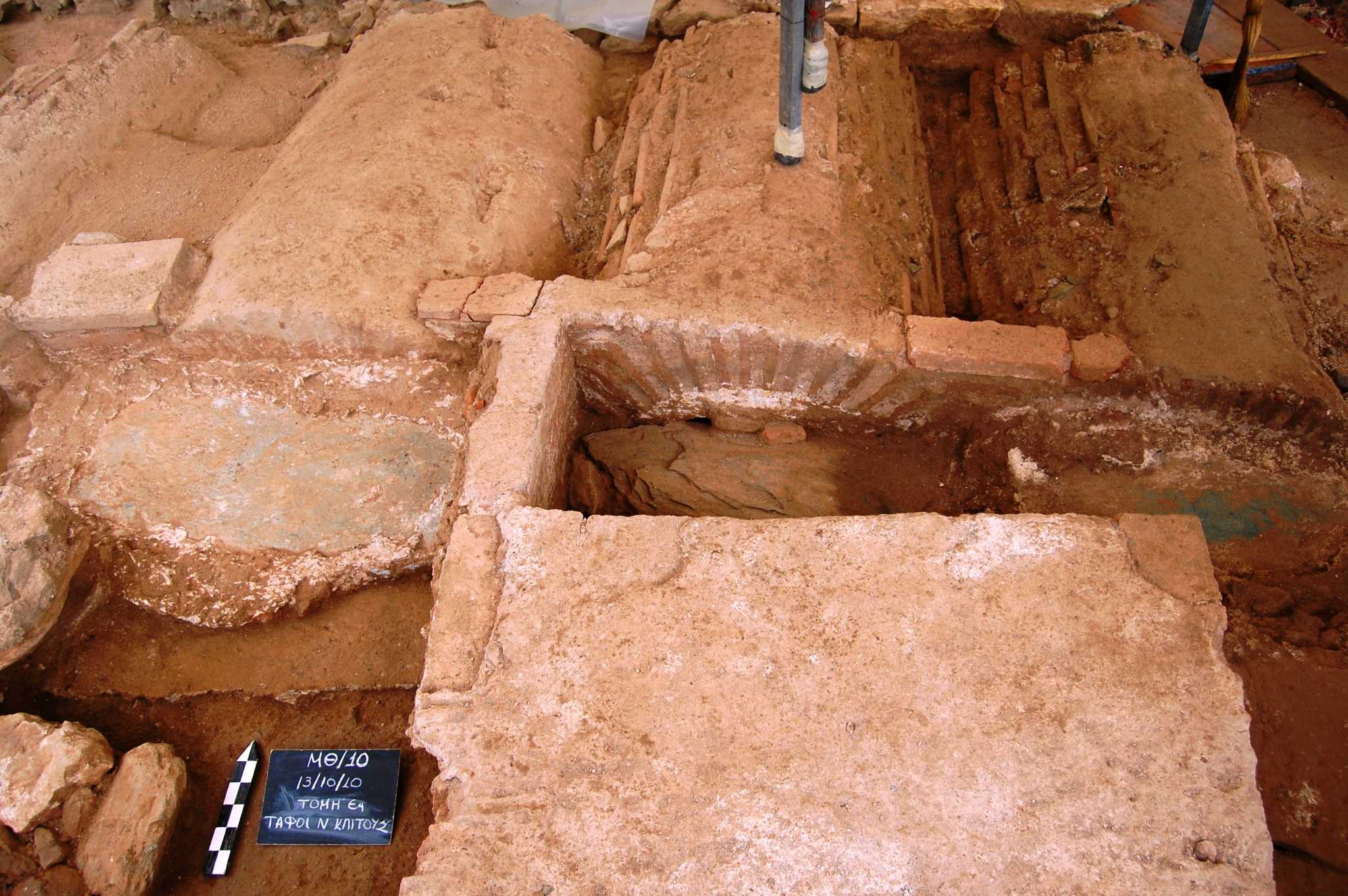 Η παλαιοχριστιανική Βασιλική, σχεδόν σε όλο το νότιο κλίτος της, καταλαμβάνεται από μία συστάδα τάφων οι περισσότεροι είναι καμαροσκεπείς. Σε έναν από αυτούς -που σύμφωνα με την κεραμική και τα γύρω ευρήματα πρέπει να χρονολογείται στις αρχές του 5ου αιώνα μΧ- βρέθηκε ένας σκελετός άντρα, δίπλα στον οποίο υπήρχαν υπόλοιπα οπλισμού.