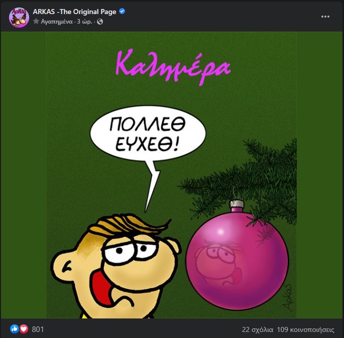 Στο νέο του σκίτσο βλέπουμε τον αγαπημένο ήρωα μικρών και μεγάλων, τον Θανασάκη, να κάθεται μπροστά από το χριστουγεννιάτικο δέντρο και να μας δίνει… «πολλέθ ευχέθ».