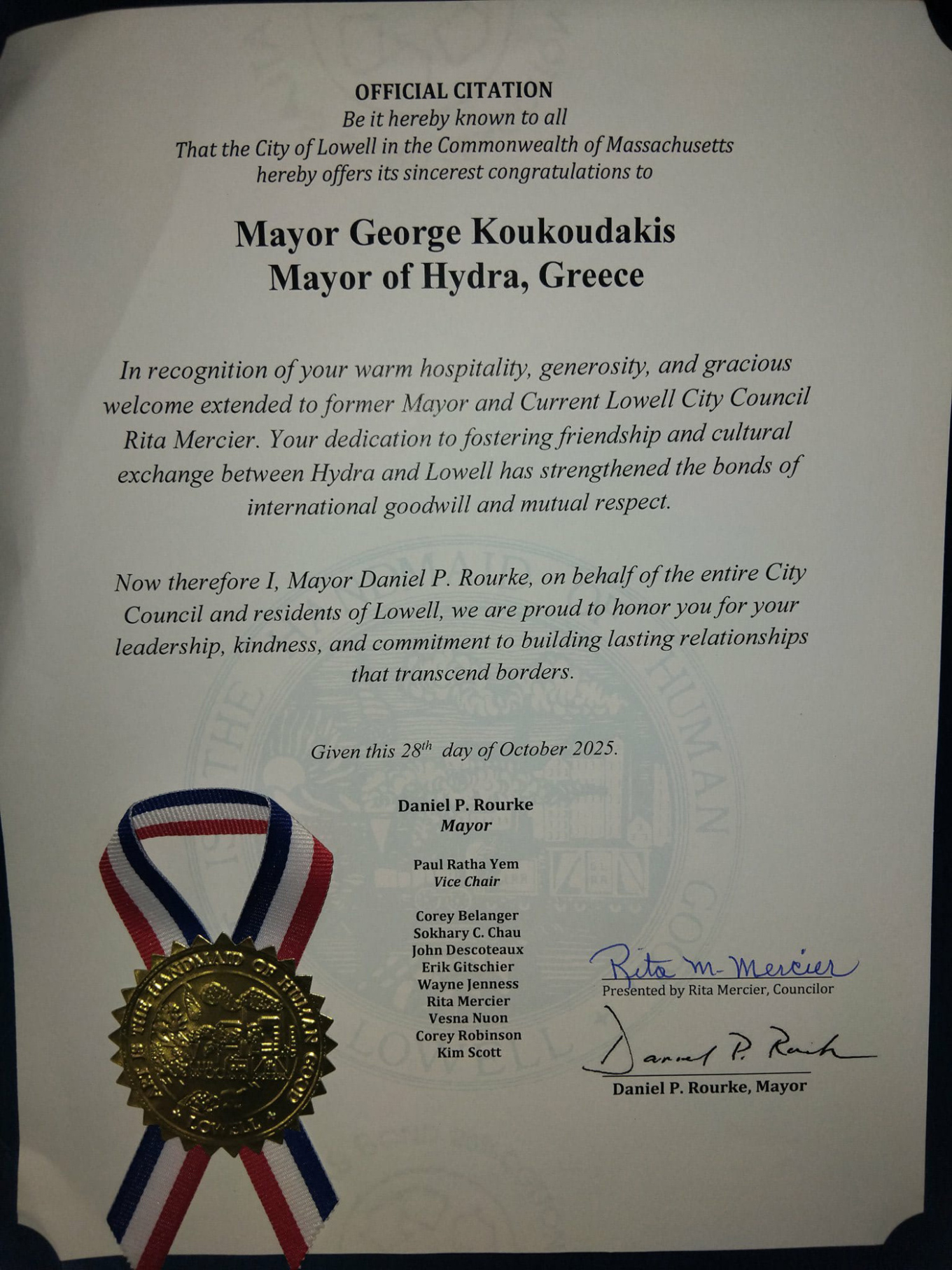Έπαινο «για την προώθηση της πολιτιστικής ανταλλαγής και του αμοιβαίου σεβασμού μεταξύ της Ύδρας και της πόλης Lowell» της Μασαχουσέτης απένειμε το δημοτικό συμβούλιο της αμερικανικής πόλης, στον δήμαρχο Ύδρας Γιώργο Κουκουδάκη.