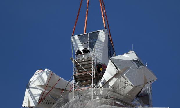 Το κομμάτι, που τοποθετήθηκε σήμερα, όταν το επέτρεψαν μετά από μέρες οι καιρικές συνθήκες, είναι το τελευταίο κομμάτι από τους ύψους 17 μέτρων σταυρούς στην κορυφή των πύργων.