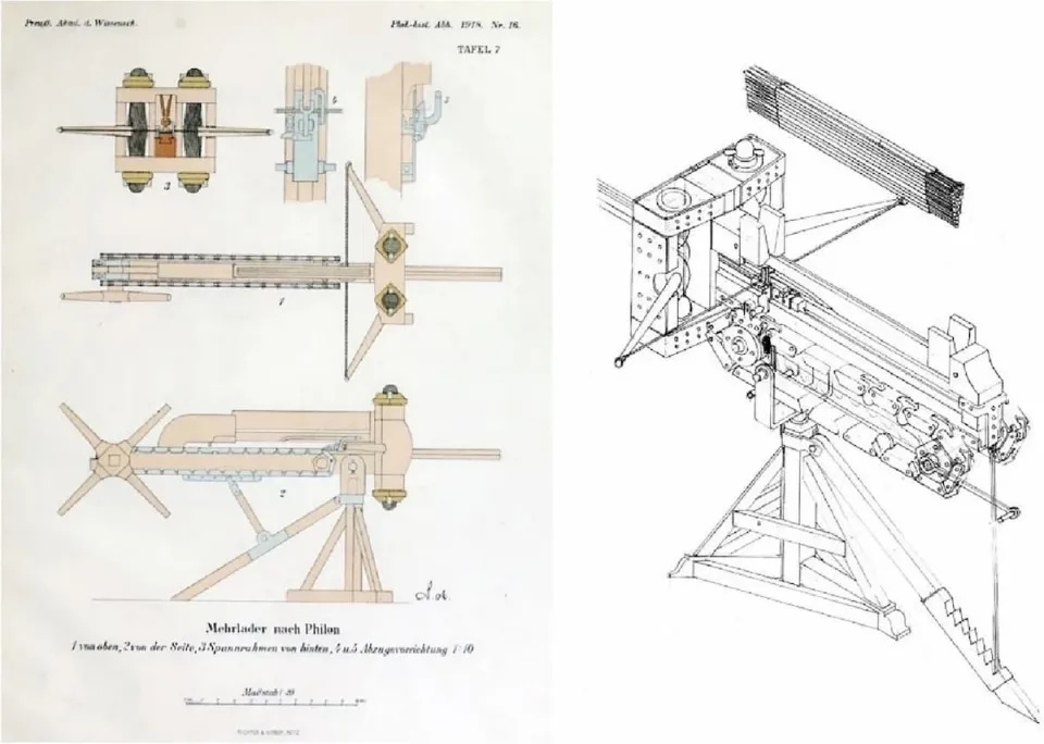 Το polybolos λειτουργούσε με ένα σύστημα αλυσίδας και γραναζιών που φόρτωνε αυτόματα τα βλήματα, επιτρέποντας ταχεία και επαναλαμβανόμενη εκτόξευση – κάτι που το καθιστά το πλησιέστερο αντίστοιχο ενός σύγχρονου πολυβόλου στην αρχαιότητα.