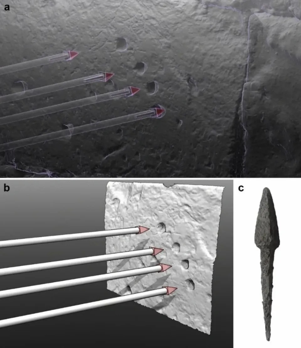 Η πιο πιθανή εξήγηση, σύμφωνα με την ομάδα, είναι ότι τα σημάδια προκλήθηκαν από το λεγόμενο polybolos, ένα εξελιγμένο όπλο ελληνικής επινόησης, το οποίο μπορούσε να εκτοξεύει διαδοχικά βέλη με μηχανικό τρόπο. Το όπλο αποδίδεται στον Διονύσιος ο Αλεξανδρεύς και περιγράφεται αναλυτικά από τον Φίλων ο Βυζάντιος τον 3ο αιώνα π.Χ.